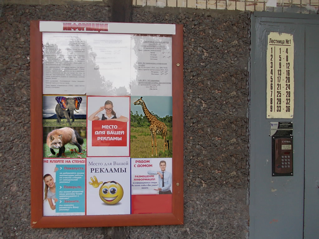 Многие дома в городах оборудованы информационными стендами, которые установлены в подъездах. Практически в каждом подъезде установлен информационный стенд , на котором размещаются рекламные материалы. Однако возникает вопрос: каким образом рекламные материалы монтируются на информационном стенде? Размещение рекламы в подъездах осуществляет наше рекламное агентство, т.к. у нас заключены соответствующие договоры с управляющими компаниями, ТСЖ и т.д. Специалисты Фасад Медиа Групп производят монтаж рекламы применяя специальные крепежные инструменты для информационного стенда.